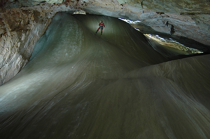Am Seil hängen wir über stalagtitenbewachsenen Wänden, fotografieren die skurrilsten Formationen und "Mondmilch", erahnen den tobenden Fluss, der sein Brodeln und Rauschen aus der untersten, noch immer aktiven Zohne der Höhle zu uns herauf schickt.